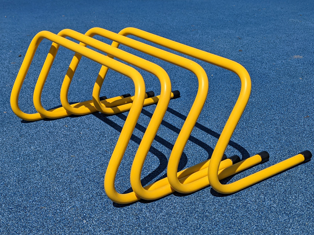 ミニハードルは、高さ15センチから20センチ程度の障害物となり、トレーニング動作に「高さ」の要素が加わります。